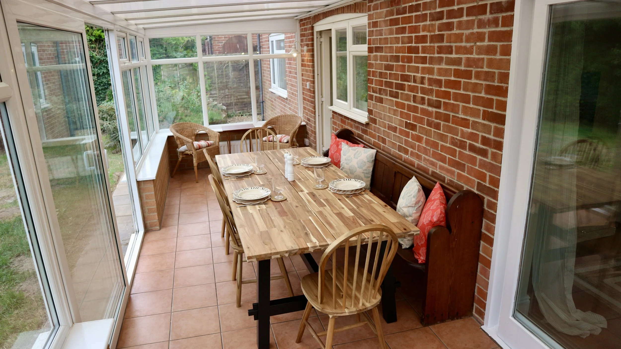 The conservatory houses the dining area, a large table which will seat up to 10 guests. We have a high chair for you to use as well, this is stored in the hallway cupboard. There are also comfy seating areas and lots of books for you to while away an afternoon in the sun.